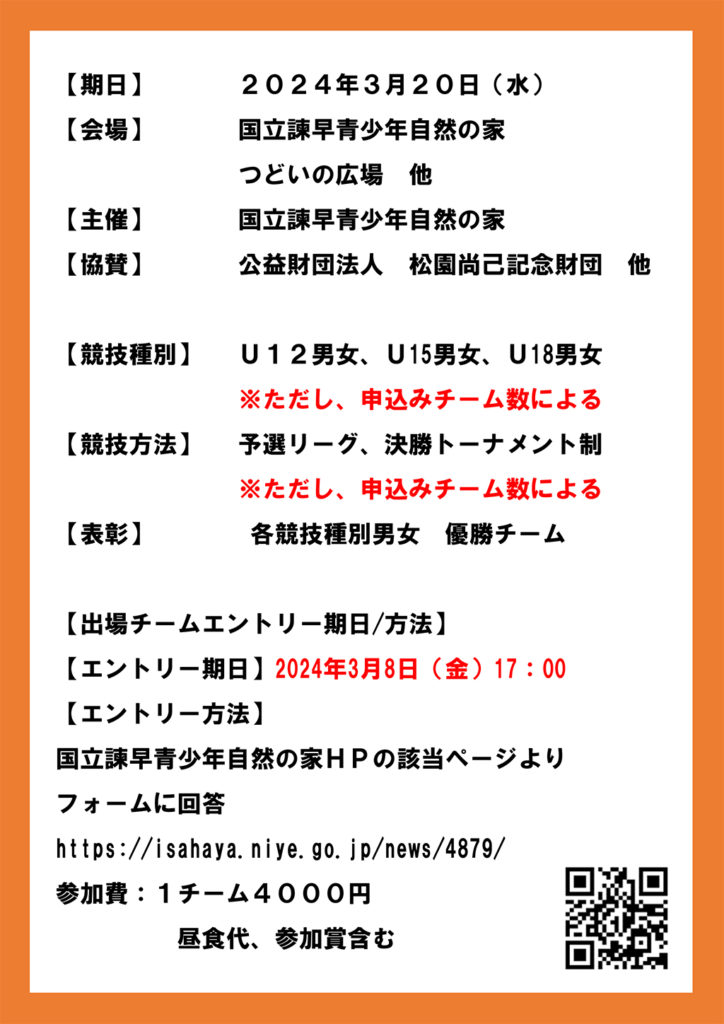 期日: 2024年3月20日(水)会場:国立諫早青少年自然の家 つどいの広場 他主催:国立諫早青少年自然の家協賛:公益財団法人 松園尚己記念財団 他