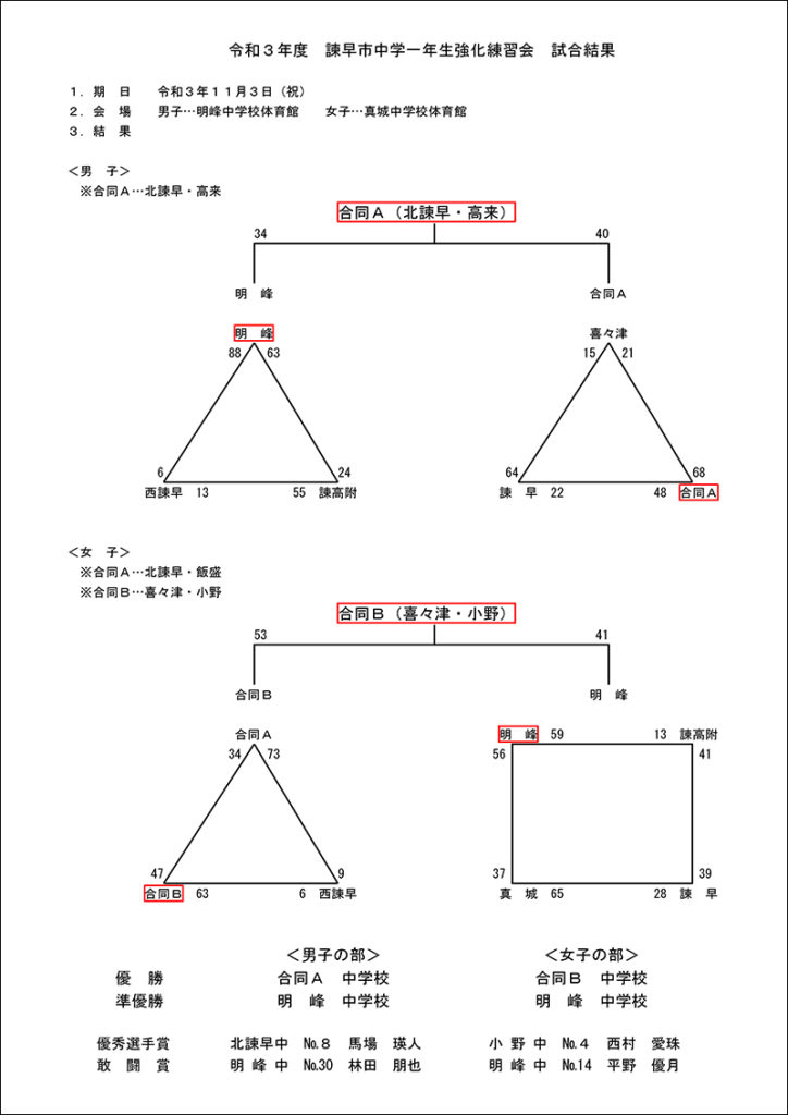 会場:男子・・・明峰中学校体育館(A・B)会場:女子・・・真城中学校体育館(C・D)