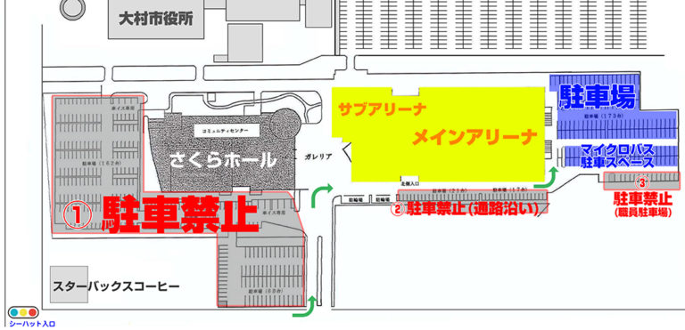 各会場ともに、専門部発行の駐車券がない車は駐車できません。また、大型バスの会場への駐車はできません。スムーズな大会運営への御協力をお願いします。